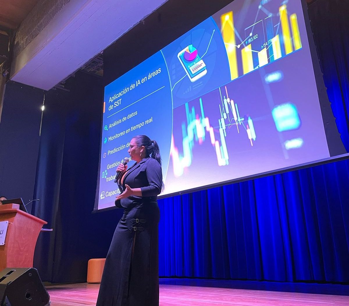 En su intervención nos explicaba como funciona la IA en SST y como puede ser aplicada, los beneficios de la IA en SST y cuáles son los desafíos y consideraciones que se deben tener en cuenta, nos expuso algunos casos concretos de predicción, detección, evaluación y monitoreo, finalizando su intervención contándonos sobre la IA y en donde se está aplicando en Colombia.